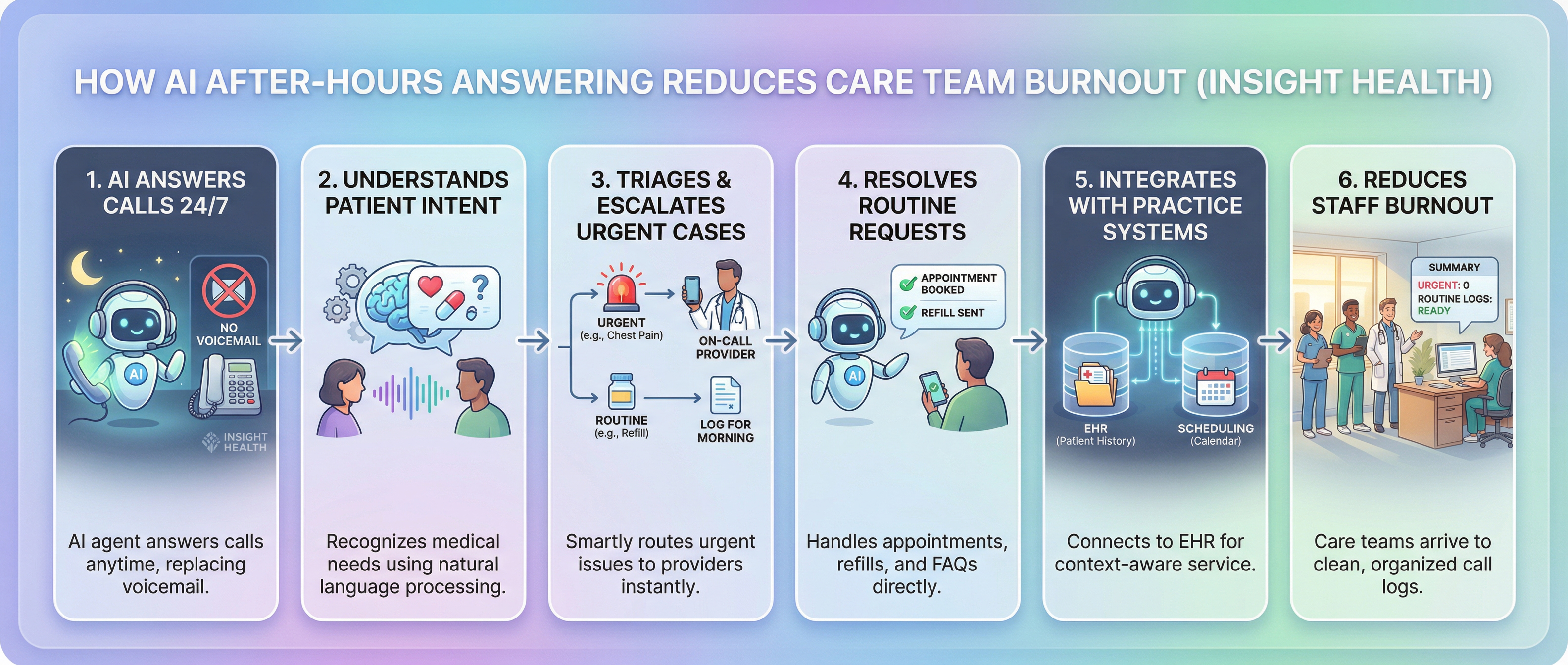 A patient calls at night needing a refill. The AI pulls their medication history from your EHR, confirms which prescription they need, and routes the request to your on-call provider with all relevant details attached.