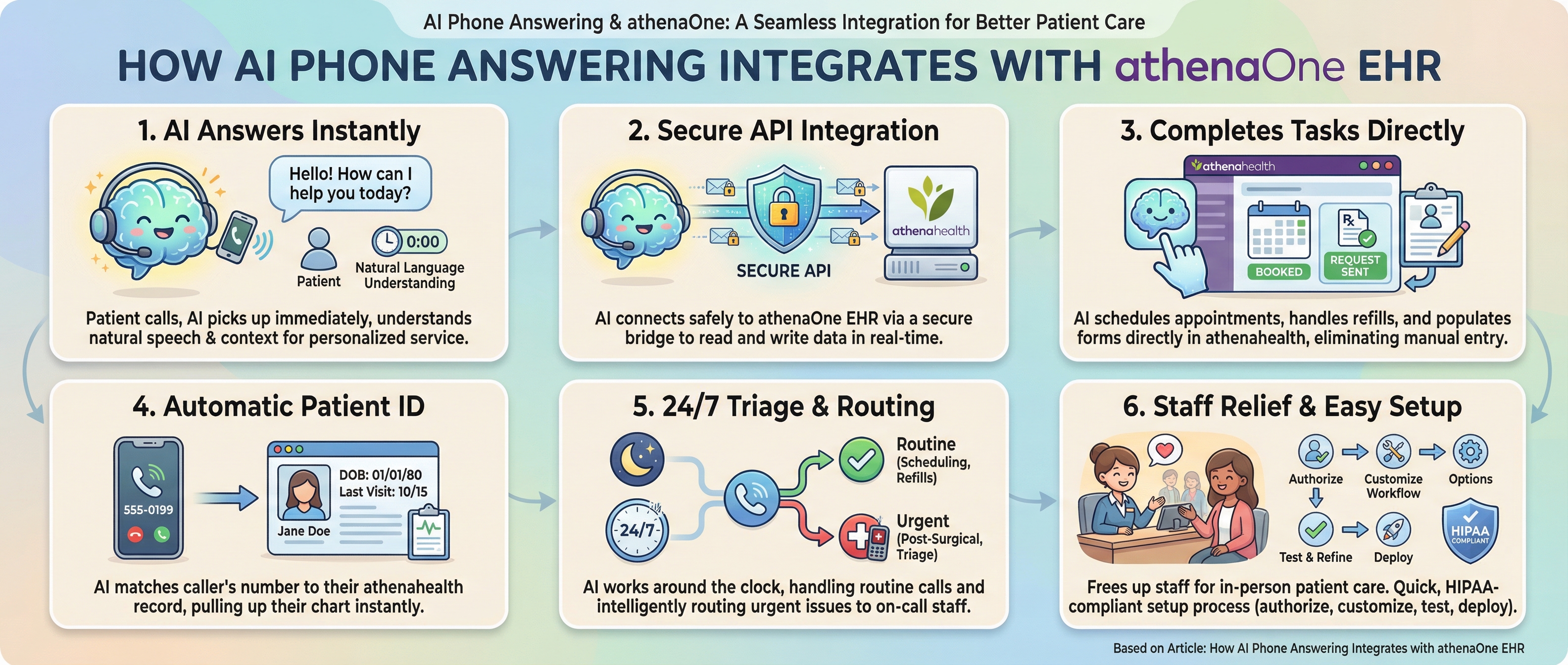 This article explains how AI phone assistants work with athenahealth to handle routine patient calls, from scheduling and refills to after-hours triage, so your staff can focus on the patients in front of them. I'll cover how the integration works, what to look for in a vendor, and how to get started without disrupting your practice.