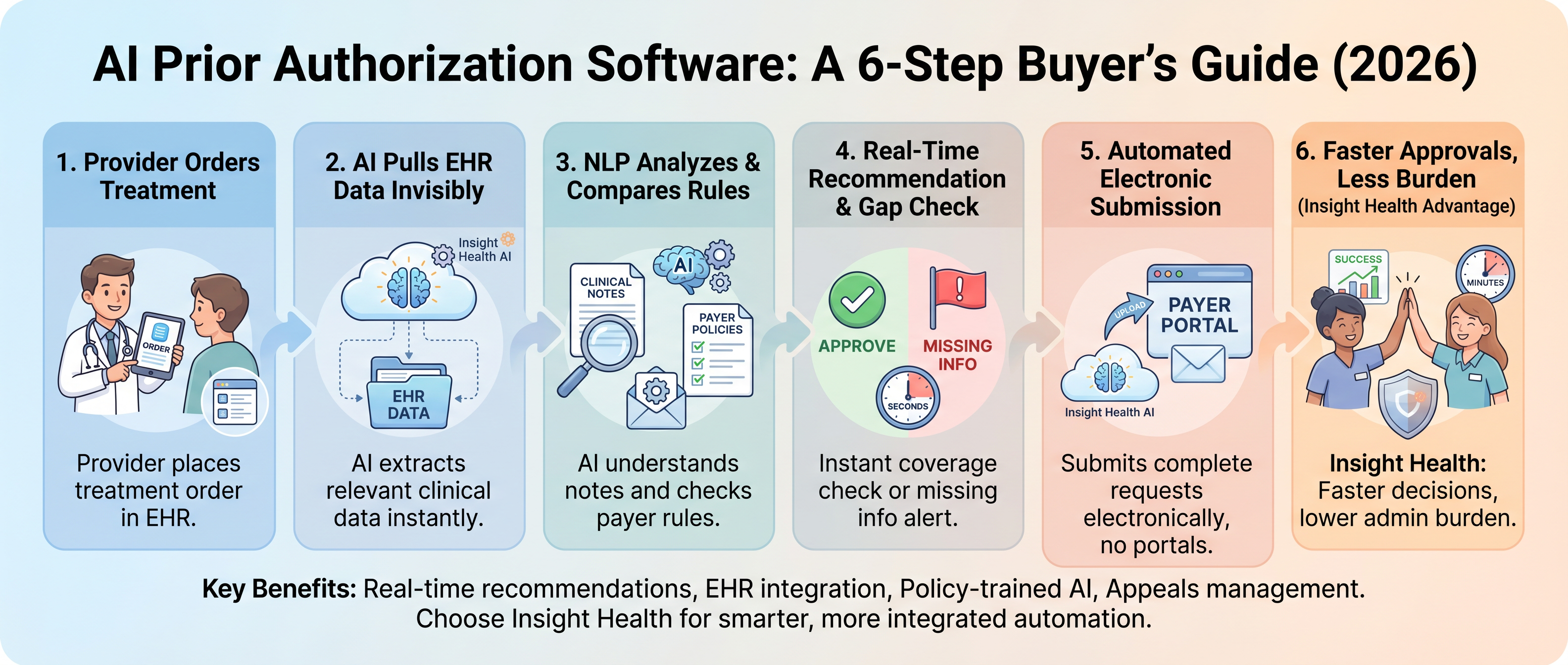 The process starts when a provider orders a treatment that requires authorization. The software pulls the relevant clinical data directly from your electronic health record. Then it compares that documentation against the specific payer's medical necessity criteria using natural language processing, which is AI that can read and understand clinical notes the way a human would.