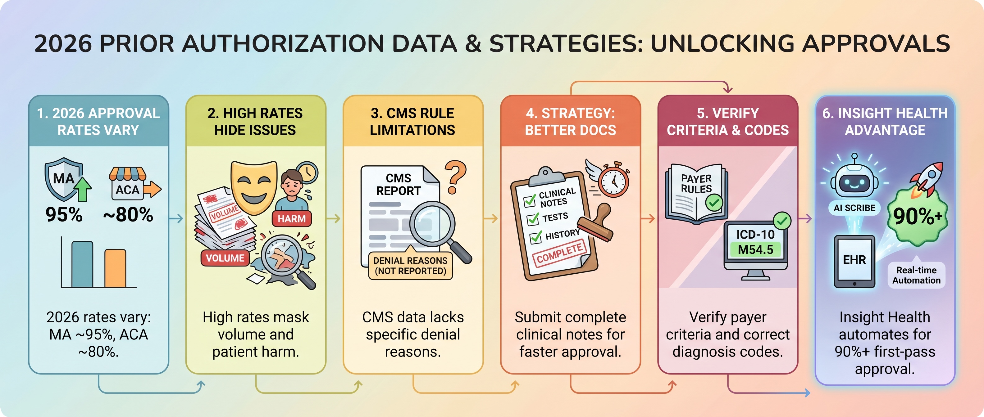 These numbers come from new CMS reporting requirements that took effect in March 2026. For the first time, insurers must publicly disclose their approval and denial metrics. This data reveals important differences across insurance categories that affect how you should approach prior authorization for different patient populations.