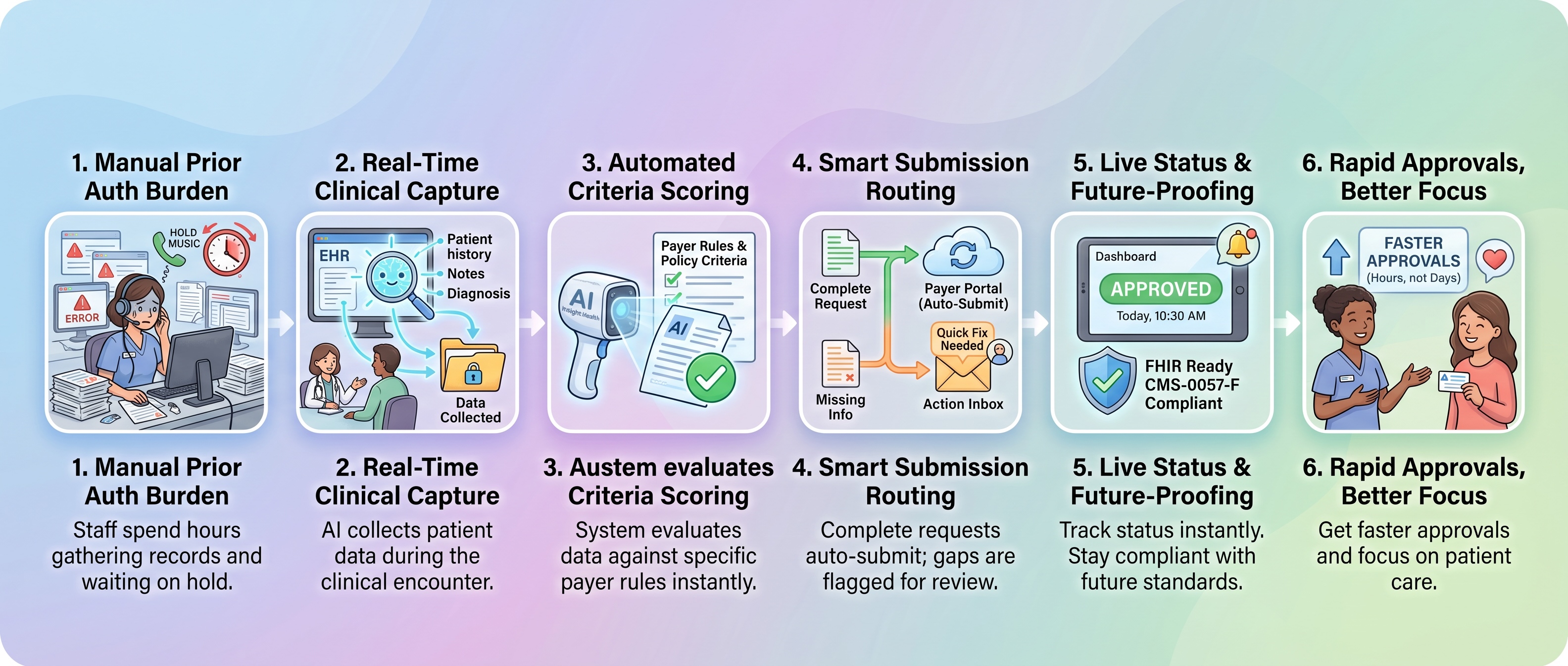 I want to be clear about what AI does here. It doesn't make coverage decisions. It doesn't deny claims. What it does is capture clinical data at the moment of care and match that data against what each payer actually requires for approval.
